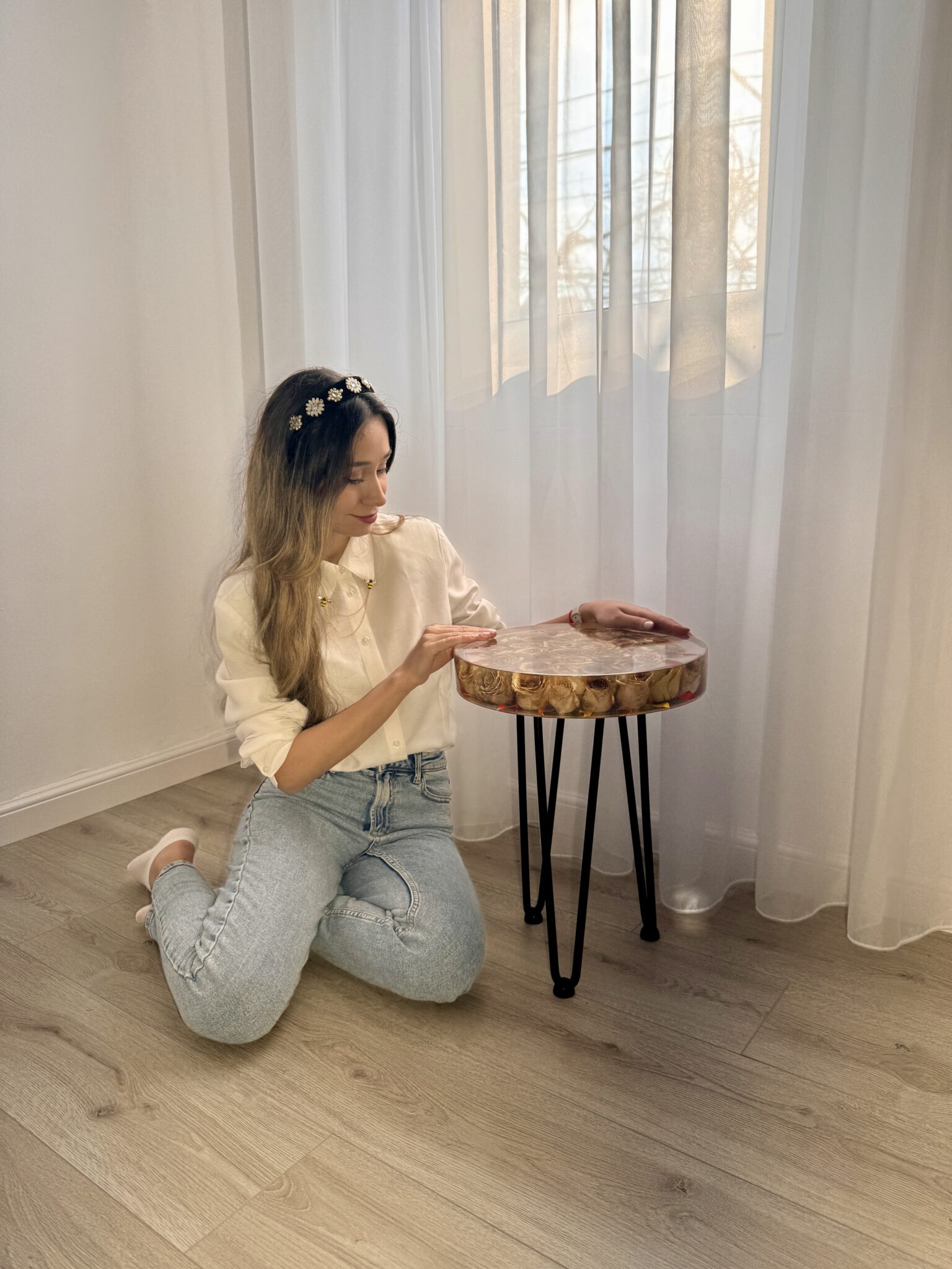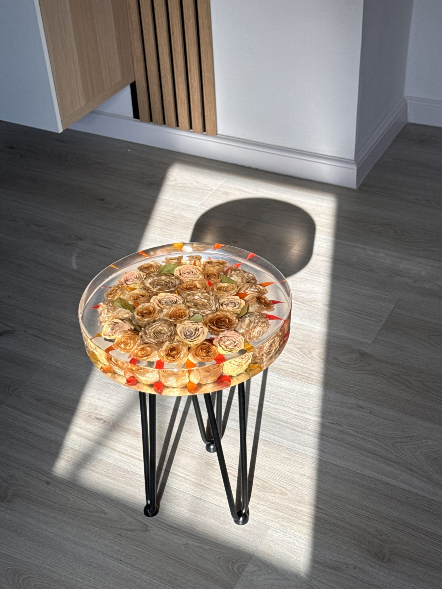 Piesă statement cu valoare emoțională și funcționalitate, masa decorativă din rășină epoxidică transformă amintirile în artă de interior. Ideală pentru conservarea florilor din buchete importante, invitații sau detalii textile, fiecare masă este unică și poate fi personalizată în funcție de povestea dumneavoastră.