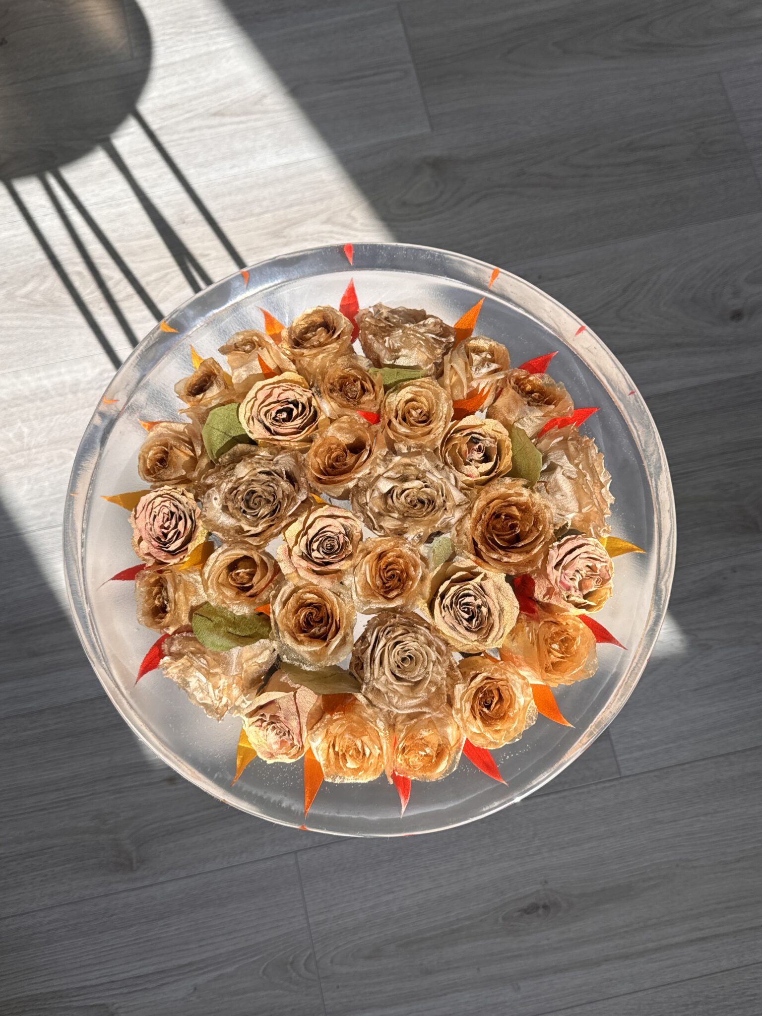 Cu o prezență sculpturală și un caracter profund personal, masa decorativă din rășină cristalină este mai mult decât un obiect de mobilier – este o piesă statement, care spune o poveste. Fiecare masă este realizată manual, pornind de la o compoziție florală aleasă cu grijă și transpusă într-o formă durabilă, artistică și funcțională.