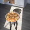 Florile și rășina sunt turnate direct în structura unei măsuțe preexistente, aleasă în funcție de design și înălțimea florilor.-